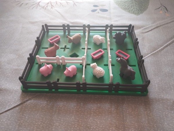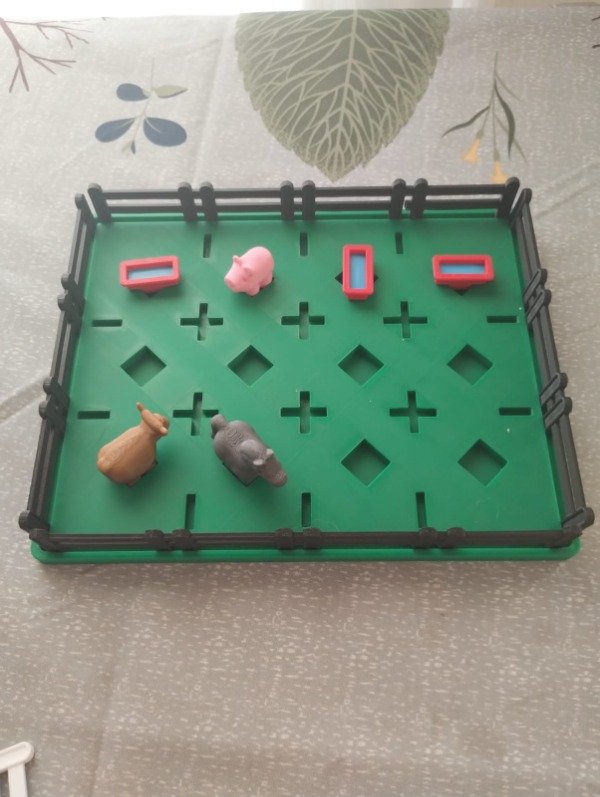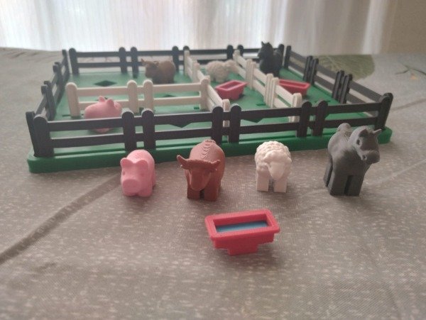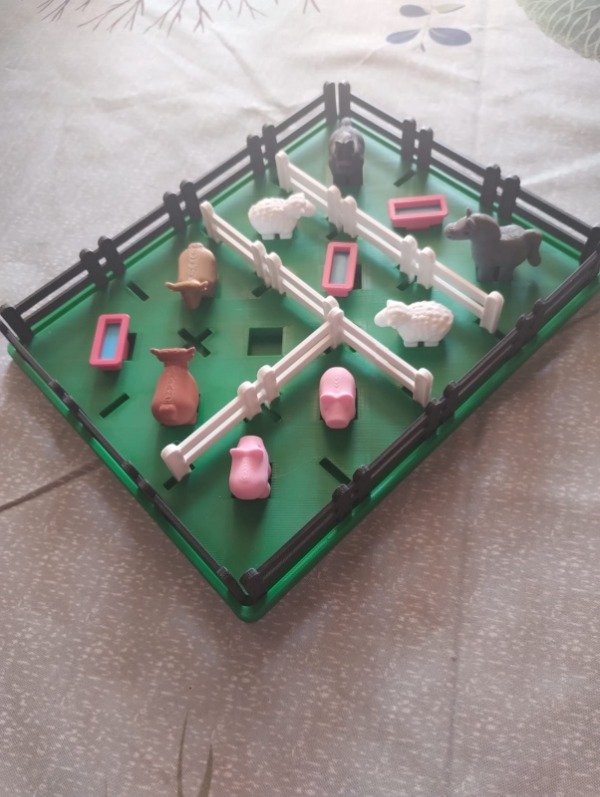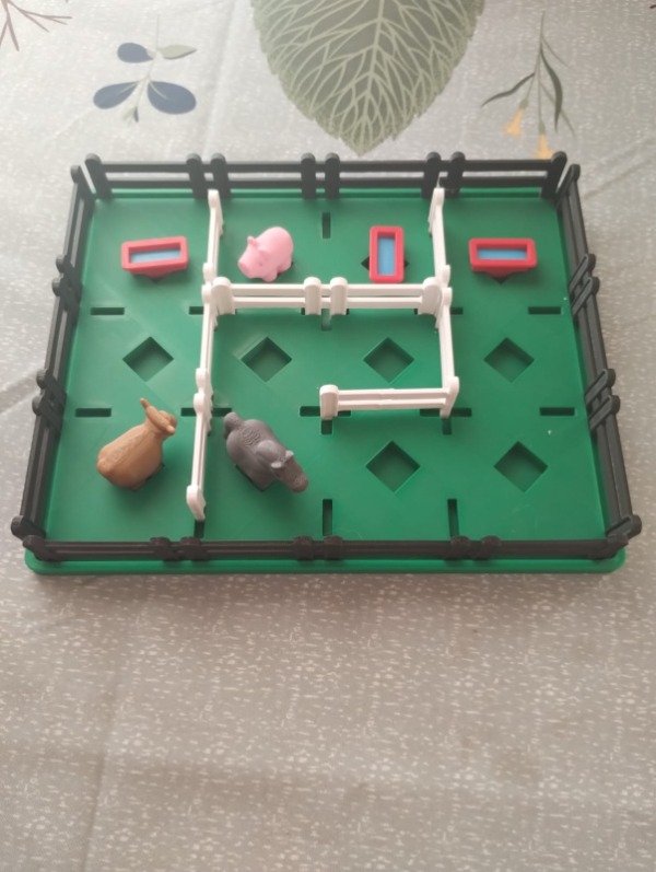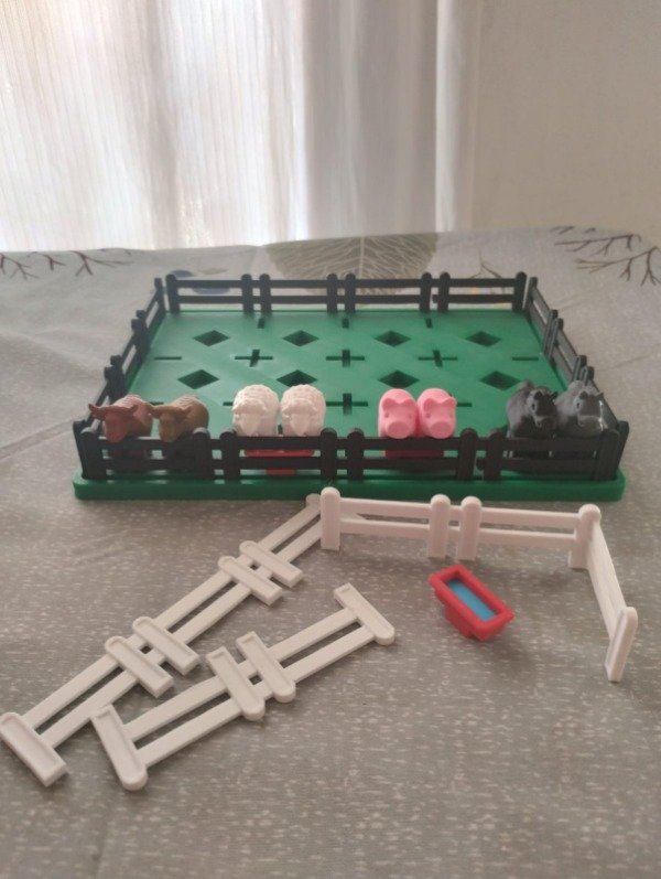 Incluye tablero, cercas y piezas de animales en distintos colores y formas.